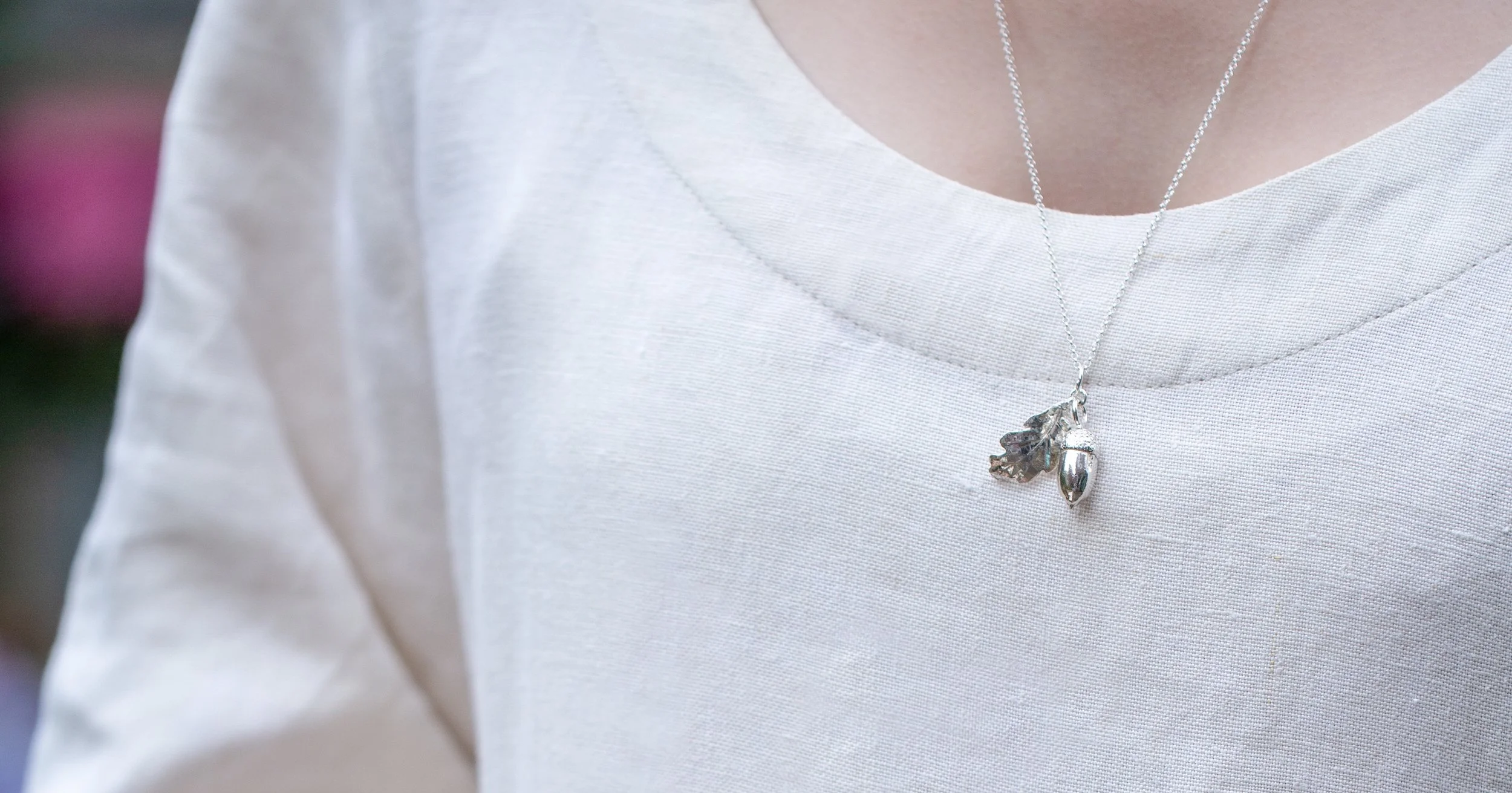 Discover acorn jewellery, with pretty oak leaves, crafted from recycled silver in my leafy garden studio. These pieces echo the textures and details found in wild woodlands. Discover my bestselling acorn and oak leaf jewellery to inspire you for generations to come.